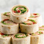 Italian Pinwheels are a delightful appetizer featuring layers of Genoa salami, pepperoni, provolone cheese, and romaine lettuce rolled up in a soft flour tortilla with a flavorful pepper spread. Perfect for parties and easy to prepare ahead of time, these bite-sized pinwheels offer a combination of savory meats, creamy cheeses, and tangy peppers.