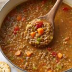 A hearty and flavorful Lentil Sausage Soup combining spicy or mild ground sausage with brown lentils, vegetables, and a rich broth infused with herbs and spices. Perfect for a comforting, protein-packed meal.
