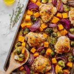 This Sheet Pan Maple Glazed Chicken with Vegetables is a wholesome, flavorful dinner featuring tender chicken thighs baked alongside butternut squash, Brussels sprouts, and red onion. The chicken is brushed with a sweet and savory maple-ginger glaze that caramelizes beautifully in the oven for a deliciously balanced meal that’s easy to prepare and clean up.