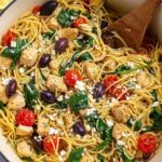 - Add Vegetables: Stir in spinach, cherry tomatoes, and kalamata olives. Cook for 1 minute more, allowing pasta to absorb some liquid.