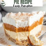 A creamy, no-bake pumpkin pie that comes together easily with layers of spiced pumpkin, whipped cream, and cream cheese in a graham cracker crust. Perfect for a quick and delicious fall dessert without needing to use the oven.