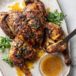 This Spatchcock Chicken recipe offers a flavorful and crispy roasted whole chicken by flattening the bird and seasoning it with a homemade blend of spices. With a simple preparation of marinating and baking on a rack, it ensures even cooking and juicy meat served alongside a delicious pan sauce made from the drippings and fresh herbs.