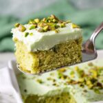 - Frost the cake: Once the cake is completely cool, evenly spread the pistachio pudding frosting over the top. Sprinkle chopped pistachios on top if desired.