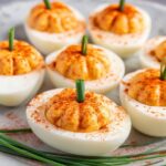 Delightfully festive Pumpkin Deviled Eggs perfect for fall gatherings. Creamy yolk filling seasoned with Dijon mustard, paprika, and black pepper, piped into perfectly boiled egg whites and decorated with chives to resemble pumpkins.