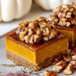 Delicious pumpkin pie bars featuring a spiced gingersnap and graham cracker crust, creamy pumpkin filling, and a crunchy pecan praline topping. Perfect for fall gatherings and dessert tables, these bars require baking and chilling for the best texture.