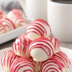 Delightful Red Velvet Cheesecake Bites combine the classic flavor of red velvet cake with creamy cheesecake, coated in smooth white almond bark and decorated with vibrant red candy melt stripes. Perfectly bite-sized treats for parties or indulgent snacking.