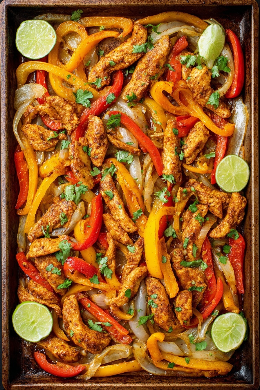 Once the sheet pan comes out of the oven, squeeze fresh lime juice over the chicken and veggies—it brightens every bite. Scatter fresh cilantro leaves on top if you like that herby pop of flavor. Serve with warm tortillas and your favorite fajita fixings like sour cream, pico de gallo, guacamole, or shredded cheese to make each fajita exactly how you like it.