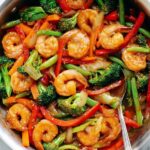 - Serve: Serve the shrimp stir fry hot, ideally over cooked rice or your choice of noodles. Garnish with optional toppings like green onions, peanuts, sesame seeds, or crunchy noodles as desired.