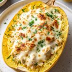 A healthier take on classic chicken Alfredo, this Skinny Chicken Alfredo Stuffed Spaghetti Squash features tender spaghetti squash filled with a creamy chicken Alfredo sauce made with reduced-fat milk and Parmesan cheese, topped with mozzarella, and baked until bubbly and golden.