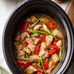 A flavorful slow cooker recipe for Salt & Pepper Sticky Chicken featuring tender chicken breast chunks cooked in a savory and sticky sauce with ginger, soy sauce, and spices, finished with crunchy red peppers and spring onions. Perfect served with rice or noodles for an easy, satisfying meal.