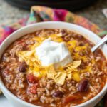 Transfer the browned beef to your slow cooker, then add chopped onion, minced garlic, cans of fire-roasted tomatoes, chili beans, black beans, tomato sauce, and beef broth. Give everything a gentle stir so the ingredients mix well but you don’t smush the beans too much. Set it on low for 4-5 hours or high for 2-3 hours—whichever fits your schedule.