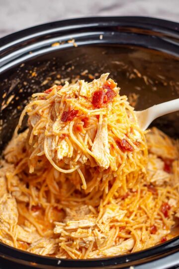 Once the chicken is tender, shred it right in the pot using two forks. Then stir in the cream cheese cubes until melted for a velvety texture. If you prefer sour cream or Greek yogurt, remove the slow cooker insert from heat before stirring it in to prevent curdling.