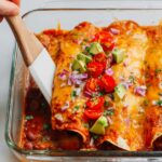 - Add vegan queso if using: If using vegan cashew queso instead of cheese, omit the cheese layers and pour warm queso over the baked enchiladas just before serving.