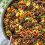 This Beef Fried Rice recipe features tender strip steak and fluffy eggs combined with savory soy and beef broth sauce, tossed with aromatic garlic, peas, carrots, and green onions for a flavorful homemade takeout classic that's crispy and satisfying.