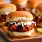 These Nashville Hot Chicken Sliders feature spicy, crispy, juicy fried chicken nestled inside soft slider buns along with tangy coleslaw, sliced pickles, and a flavorful homemade sauce. Perfect for serving as a crowd-pleasing appetizer or main course, these sliders capture authentic Nashville hot chicken flavor with a double-fry technique and a vibrant cayenne-spiced oil sauce.