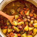 Dublin Coddle is a hearty traditional Irish stew made with thick sliced bacon, fresh pork sausages, potatoes, onions, carrots, and flavored with rich chicken broth and Guinness stout. Slow-cooked to tender perfection in the oven, this comforting dish is perfect for a cozy meal.