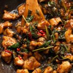 A vibrant and spicy Thai Chilli Basil Chicken recipe featuring tender chicken thigh fillets stir-fried with fragrant Thai basil, garlic, and chillies. This quick and flavorful dish is served with steamed jasmine rice, perfect for a satisfying meal inspired by authentic Thai flavors.