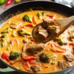 A flavorful Thai Beef Curry with Coconut Milk combining tender beef sirloin, fresh vegetables, and authentic red curry paste for a creamy, spicy, and aromatic dish perfect for a quick main course.