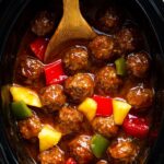 This Slow Cooker Sweet and Sour Meatballs recipe combines tender frozen meatballs with vibrant bell peppers and pineapple chunks, simmered in a tangy and sweet sauce made from pineapple juice, brown sugar, vinegar, ketchup, and soy sauce. Cooked slowly to meld flavors perfectly, it's an easy and flavorful dinner option that pairs beautifully with white rice.