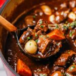 Beef Bourguignon is a classic French stew featuring tender beef braised in Burgundy red wine, infused with aromatic vegetables, herbs, and savory bacon. This hearty dish is finished with glazed pearl onions and sautéed mushrooms, delivering rich, deep flavors perfect for a comforting meal. Ideal for making ahead, it develops even better flavor when refrigerated overnight.