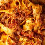 This Short Rib Ragu Pappardelle is a rich and hearty Italian-inspired dish featuring tender, slow-cooked beef short ribs simmered in a flavorful tomato and red wine sauce, served over wide ribbons of fresh pappardelle pasta and topped with parmesan and parsley.