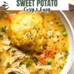 A hearty and comforting turkey soup featuring tender shredded turkey breast simmered in a flavorful broth with fresh vegetables, enhanced by fluffy sweet potato dumplings that bring a delightful texture and sweetness. Perfect for a cozy meal rich in savory spices and wholesome ingredients.