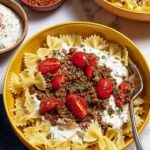 This Turkish Pasta recipe combines perfectly cooked farfalle pasta with a flavorful ground beef meat sauce, a tangy garlic yogurt sauce, and a rich spiced butter sauce. Garnished with fresh herbs and cherry tomatoes, it's a comforting and quick weeknight dinner inspired by viral Turkish flavors.