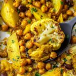 This healthy sheet pan dinner features turmeric-spiced cauliflower, potatoes, and chickpeas roasted to golden perfection with olives and fresh herbs. Served with quinoa and a dollop of Greek yogurt, it’s a vibrant Mediterranean-inspired meal that’s easy to prepare, nutritious, and full of flavor.