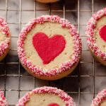 These Valentine's Slice and Bake Heart Cookies are charming, buttery treats perfect for celebrating love. Featuring a tender, lightly sweetened dough, they’re tinted with red gel food coloring, layered with a vanilla bean flavor, and coated with pink and white sprinkles for a festive touch. The slice-and-bake method makes preparation easy, with beautifully stacked heart shapes wrapped in a smooth dough log, ready for slicing and baking into adorable cookies.