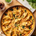 This viral one-pan Dumpling Bake features frozen veggie dumplings cooked in a rich and flavorful red curry coconut broth with fresh bok choy and zucchini. Baked to perfection, the dish is garnished with sesame seeds, green onions, cilantro, and chili crisp oil, making it a comforting and easy meal to serve over jasmine rice or noodles.