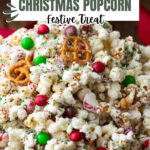 A festive and crunchy white chocolate popcorn treat combining sweet vanilla candy melts, salty pretzels, colorful red and green M&Ms, and decorative Christmas sprinkles. Perfect for holiday snacking or gifting.